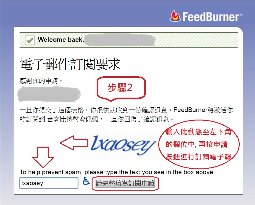 步驟2: 請輸入驗證碼至欄位中,並按[訂閱申請]